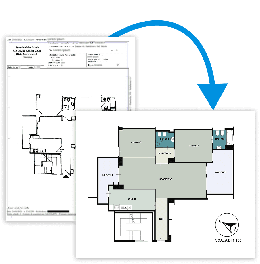 Planimetria 2D Valorizza il tuo immobile con planimetrie 2D chiare e professionali. Dalla semplice planimetria catastale a una planimetria 2D perfetta per annunci efficaci. Disponibile in JPEG o PDF per il web e in DWG per ogni esigenza tecnica.