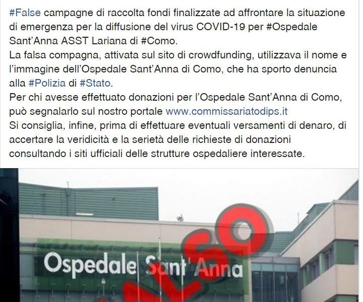 Altra falsa raccolta fondi creata su un sito di crowdfunding che sfruttava l’immagine e il nome dell’Ospedale Sant’Anna di Como, che ha sporto denuncia alla Polizia di Stato. Per chi avesse già effettuato donazioni per l’Ospedale Sant’Anna di Como, può segnalarlo sul sito www.commissariatodips.it