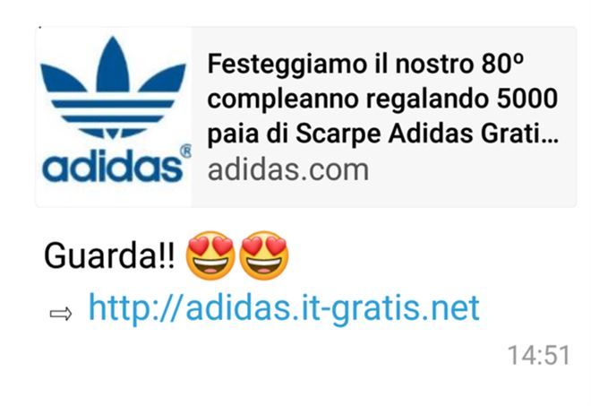 Quello che circola in questi giorni contiene questo messaggio: «Festeggiamo il nostro 80° compleanno regalando 5000 paia di scarpe Adidas Gratis. Guarda!» Cliccando sul link contenuto nel messaggio si atterra su una pagina web in cui si promette all’utente che il suo nominativo parteciperà all’estrazione di un paio di scarpe Adidas semplicemente rispondendo a qualche domanda e inserendo i propri dati per essere contattati in caso di vincita.